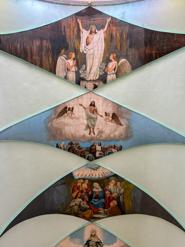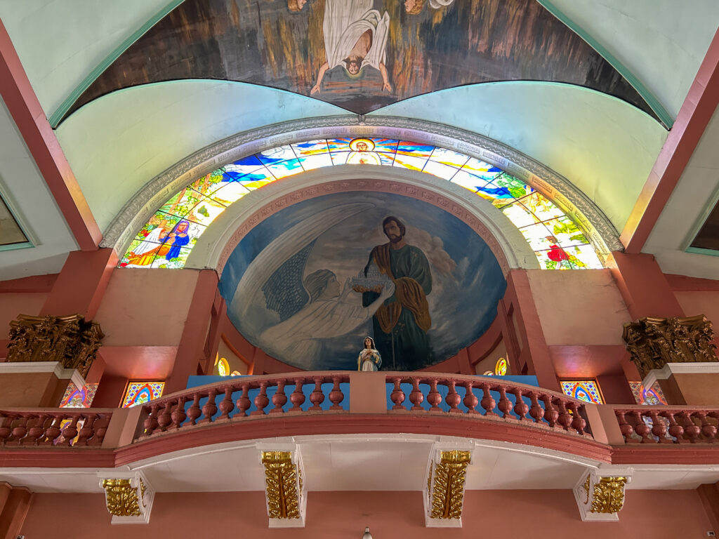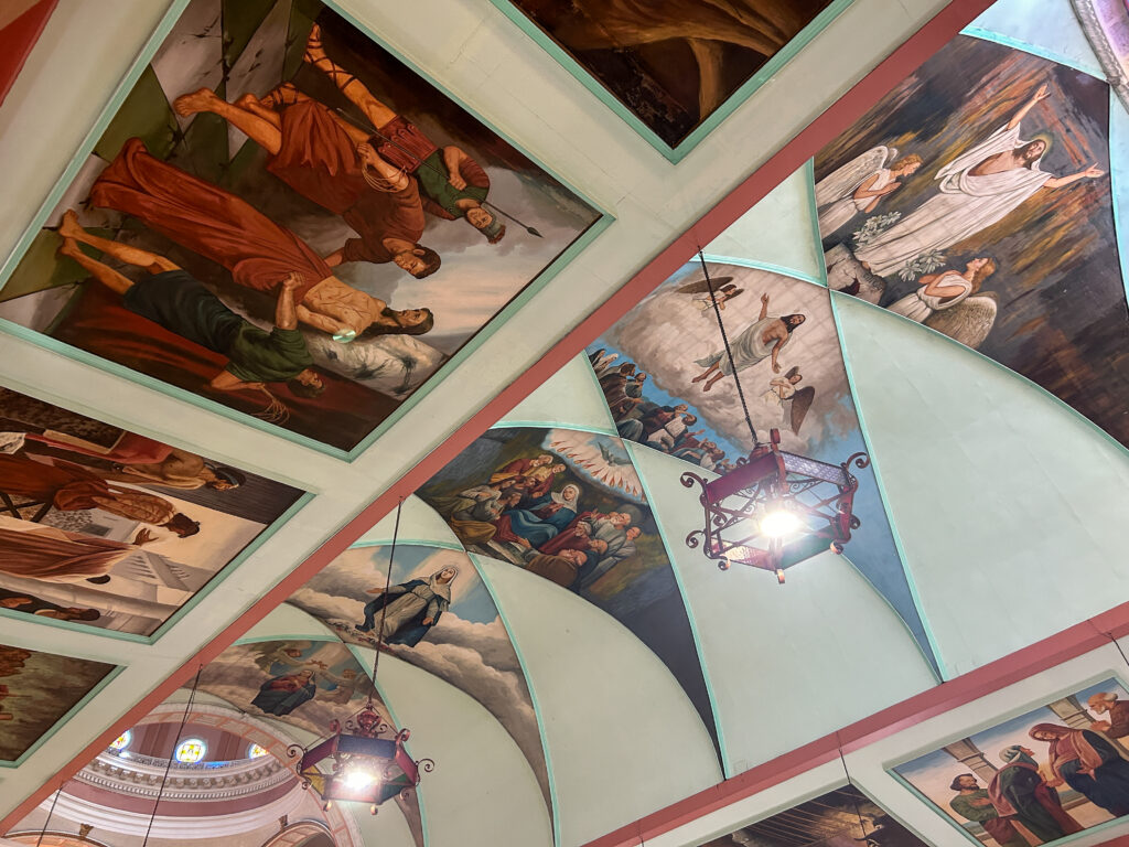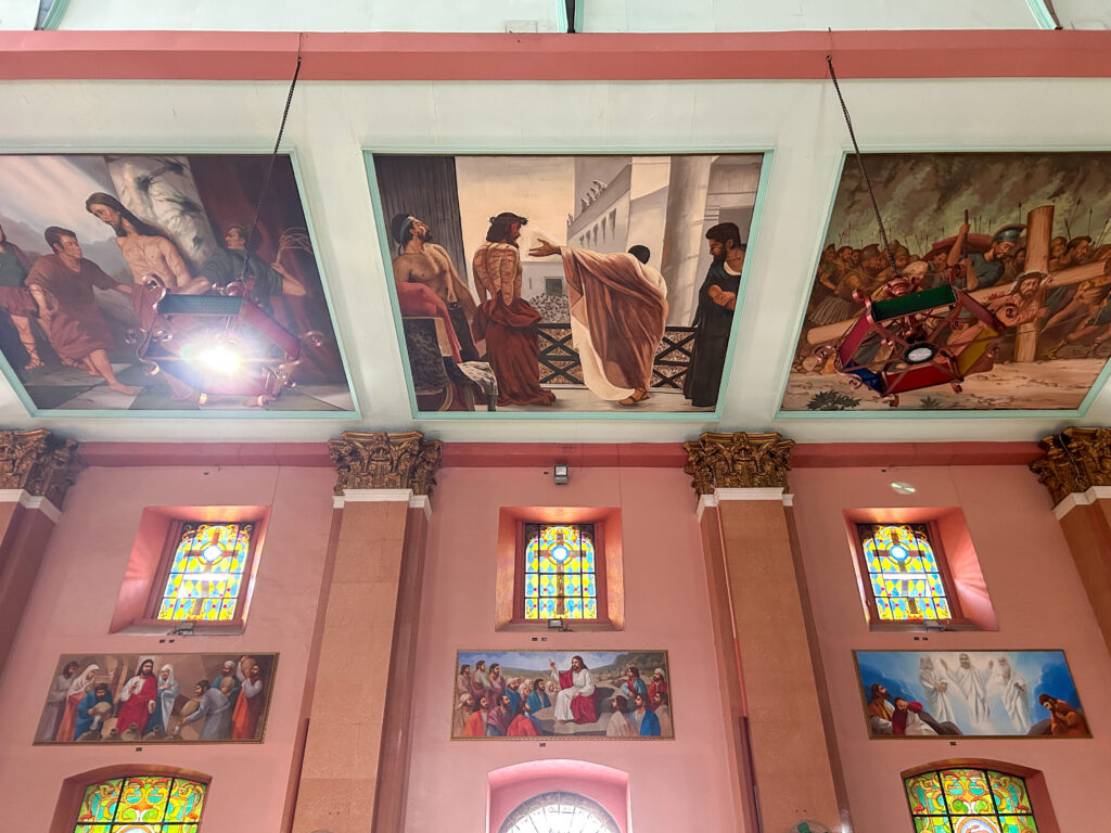 教会内は、美しいステンドグラスや多彩なフレスコ画で飾り付けられています。